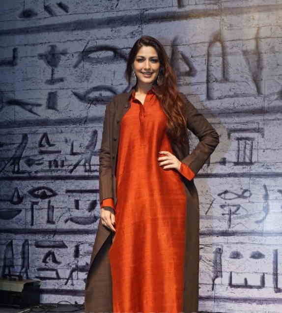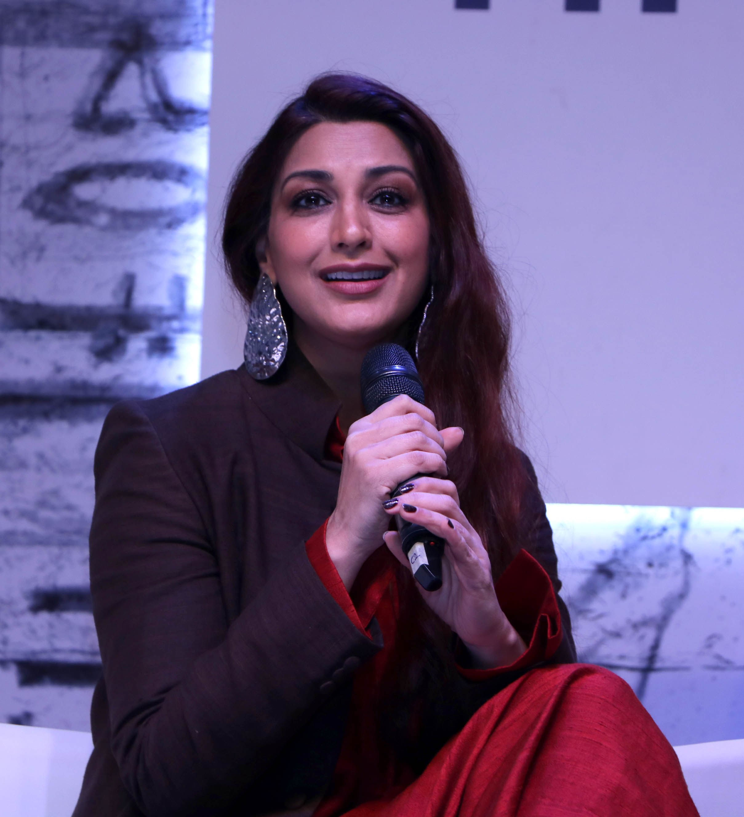 Recently, the actress attended a book launch event where she wore a layered outfit. Sonali’s look included a red raw silk long kurta, brown pants and a matching long jacket