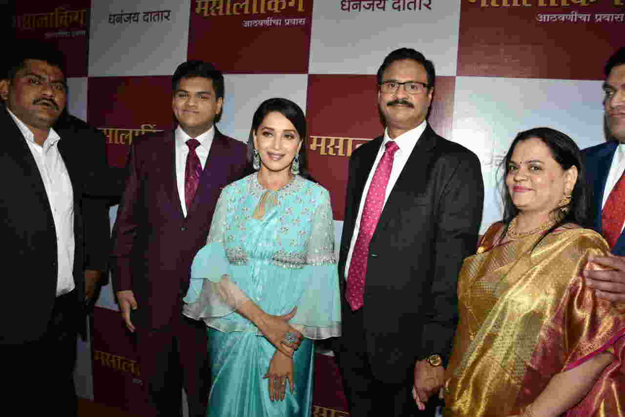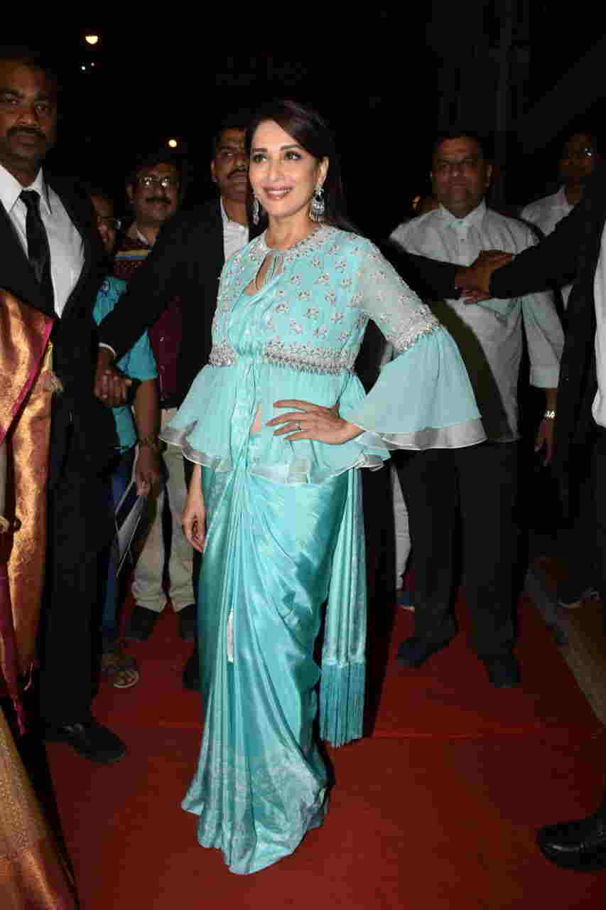 Madhuri turned up at an event in a turquoise blue saree with tassel detailing at the end of the pallu