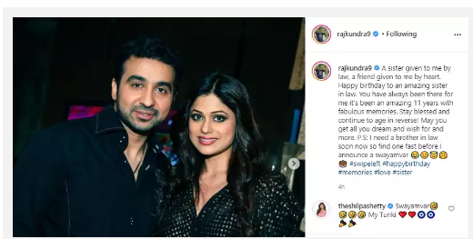 Shilpa Shetty’s husband Raj Kundra wished her sister in law a heartfelt post on instagram captioning “ “A sister given to me by law, a friend given to me by heart. Happy birthday to an amazing sister in law. You have always been there for me. It’s been an amazing 11 years with fabulous memories. Stay blessed and continue to age in reverse! May you get all you dream and wish for and more. P.S: I need a brother in law soon now so find one fast before I announce a swayamvar.”