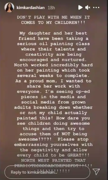Kim later lashed out to all the trolls with a strong post, she wrote "DON'T PLAY WITH ME WHEN IT COMES TO MY CHILDREN!!! My daughter and her best friend have been taking a serious oil painting class where their talents and creativity are being encouraged and nurtured. North worked incredibly hard on her painting with took several weeks to complete. As a proud mom, I wanted to share her work with everyone. I'm seeing op-ed pieces in the media and social media from grown adults breaking down whether or not my child actually painted this! How dare you see children doing awesome things and then try to accuse them of NOT being awesome? Please stop embarrassing yourselves with the negativity and allow every child to be GREAT!"