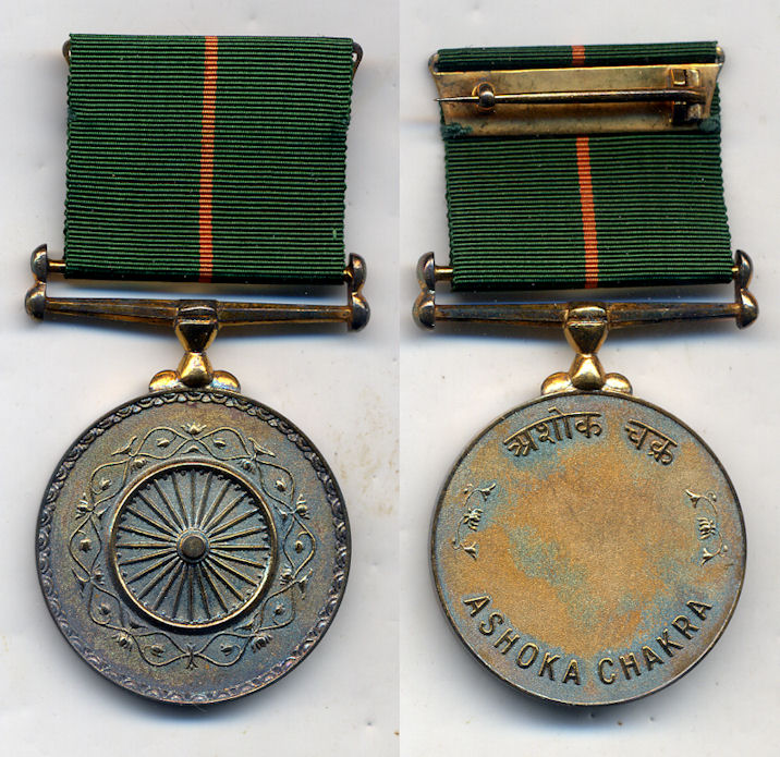 The Ashoka Chakra is India`s highest peacetime military award given for valour, courage or self-sacrifice away from the battlefield. In the peacetime it is equivalent to the Param Vir Chakra, and is given for the "most conspicuous bravery or some daring or pre-eminent valour or self-sacrifice" other than in the face of the enemy. The honour can be given either to military or civilian personnel. Ashok Chakra is comparable to US Army`s peacetime Medal of Honor and the British George Cross. Flt. Lt. Suhas Biswas was the first Indian Air Force officer to be given the Ashoka Chakra.