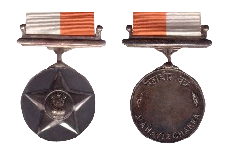 Vir Chakra is an Indian bravery award given for acts of courage in the battlefield. It replaced the British Distinguished Service Cross (DSC), Military Cross (MC) and Distinguished Flying Cross (DFC). Award of the adornment carries with it the right to use Vr.C. as a post-nominal acronym (the recipient have to ensure that they distinguish this abbreviation from that of the Victoria Cross (V.C.). It is third in superiority in the war time gallantry awards and comes after the Param Vir Chakra and Maha Vir Chakra.