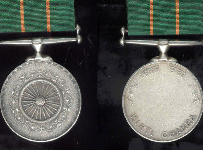 The Kirti Chakra is an Indian military honow awarded for courage, daring action or self-sacrifice done away from the field of battle. It can also be awarded to civilians as well as military personnel, including posthumous awards. It is the peacetime equivalent of the Maha Vir Chakra of wartime gallantry award. It is second in order for peacetime gallantry awards. Before 1967, the award was known as the Ashoka Chakra, Class II.
