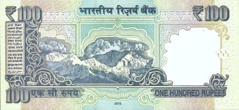 Rs. 100 note- the reverse shows the mighty Himalayan Mountains.