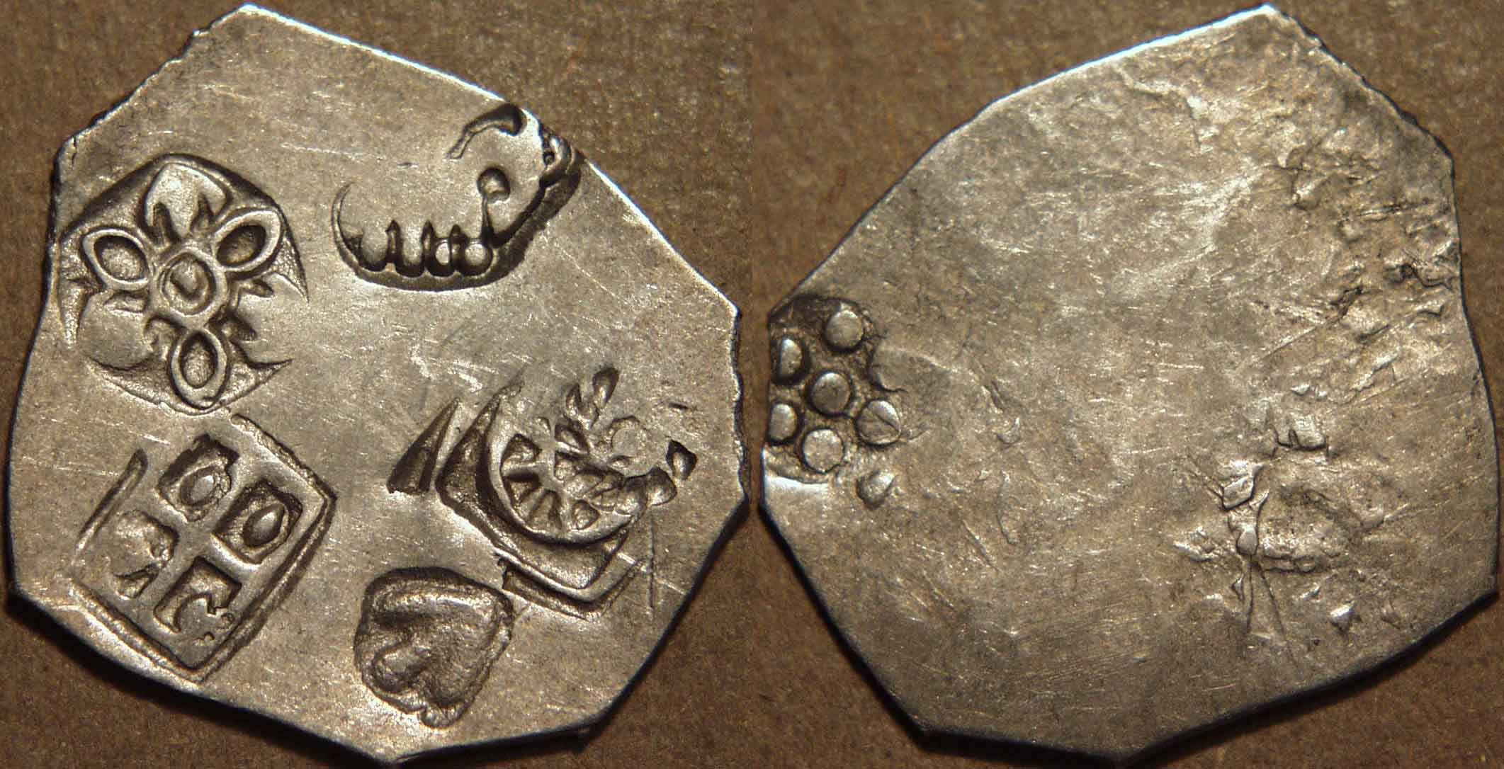 These coins were irregular in shape and were made of silver, they had different markings and symbols like Saurashtra had a humped bull, Dakshin Panchala had a Swastika and Magadha many other symbols.