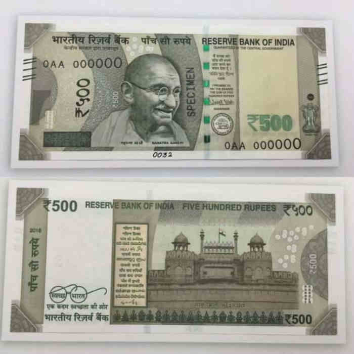 New Rs. 500 note- the reverse had the logo of Swacch Bharat Prime Minister Narendra Modi’s “clean India” campaign and has an image of Delhi’s Red Fort.