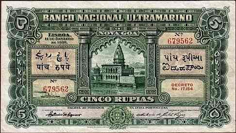 Colonial governments also printed notes to be used in their territories in India. Starting in 1883 the Portuguese issued “rupia” notes, and they were used until 1961.