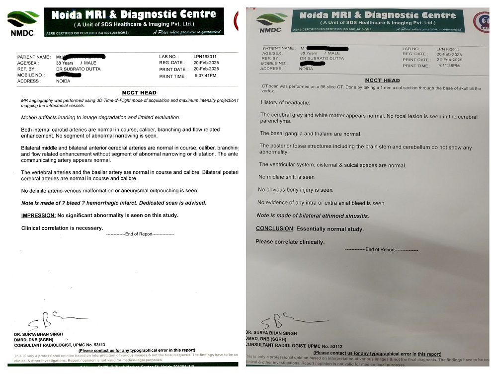 But the nightmare didn’t end there. Just a few days later, the Noida MRI & Diagnostic Center issued a second report, this time diagnosing him with sinus problems, completely contradicting the first report of a hemorrhagic infarct. The two reports, from the same medical facility, could not have been more different. What had started as a simple check-up had spiraled into an emotional rollercoaster of confusion and stress.